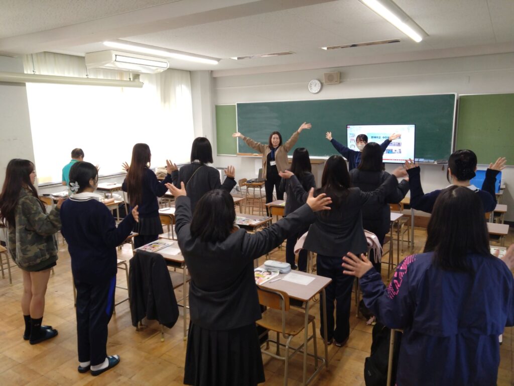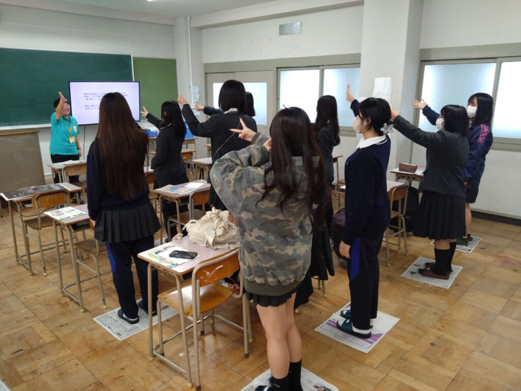 途中、子どもたちが踊っているという踊りや、遊びを一緒に楽しみ、歓声が上がる場面もありました。最後は新聞折りゲームをしてお別れ。ゲームに本気で参加して楽しそうな様子の生徒たちでした。
