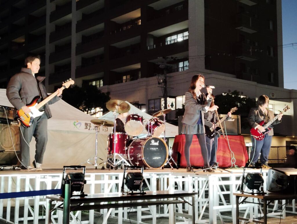 12月18日(木)、JR野洲駅南口広場で開催されている「イルミネーションパークYASU」のクリスマス・イベントに、本校軽音楽部、ダンス部、サッカー部、そして有志のみなさんが出演しました。