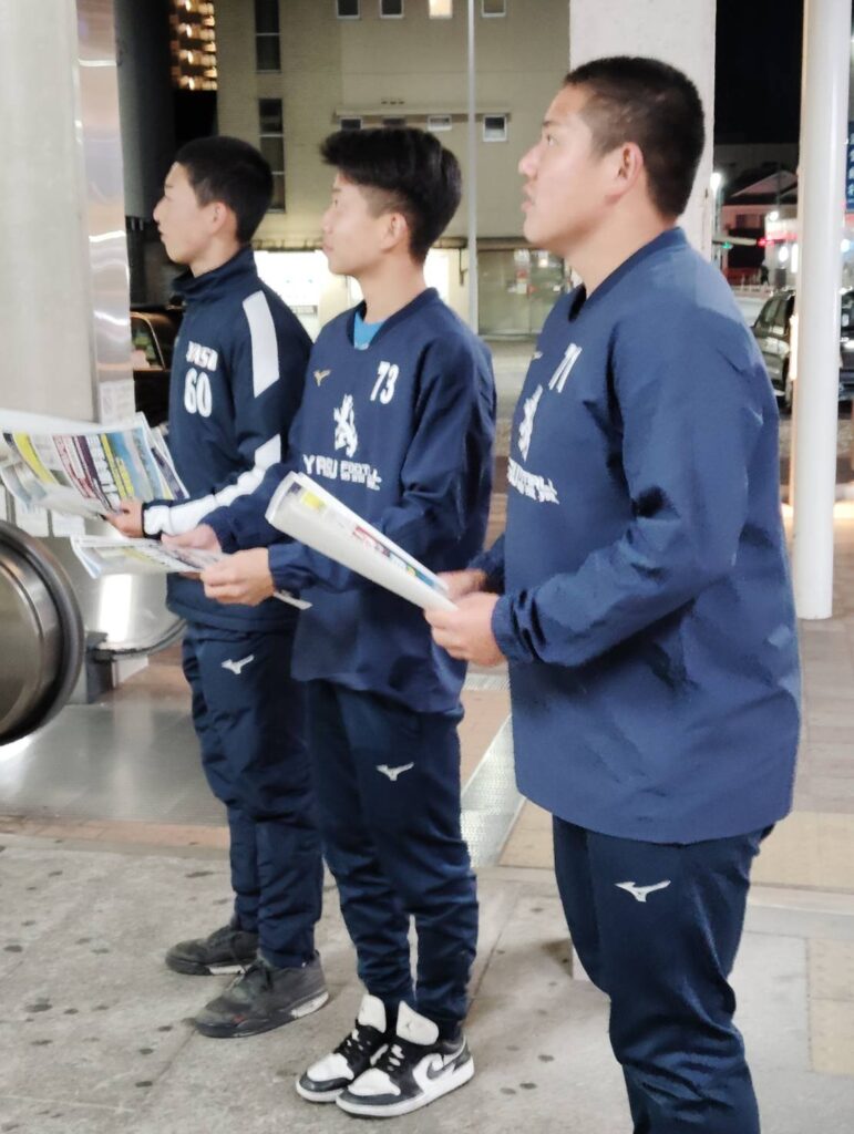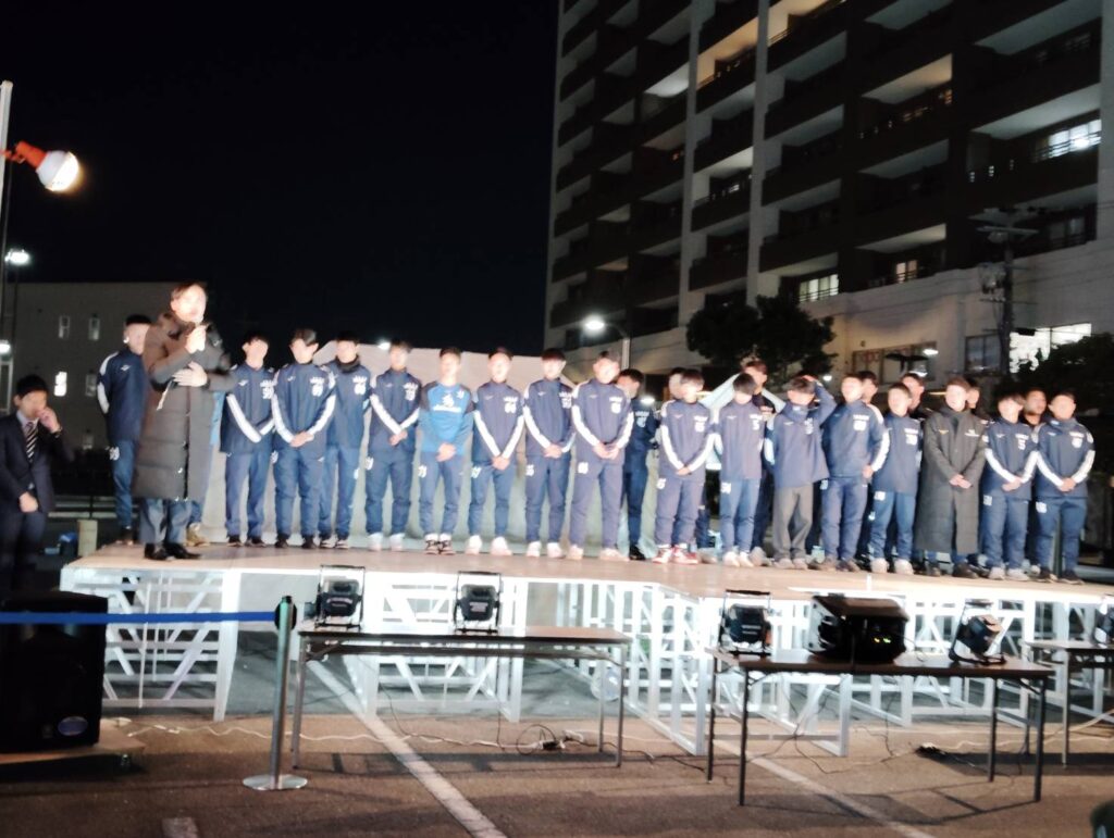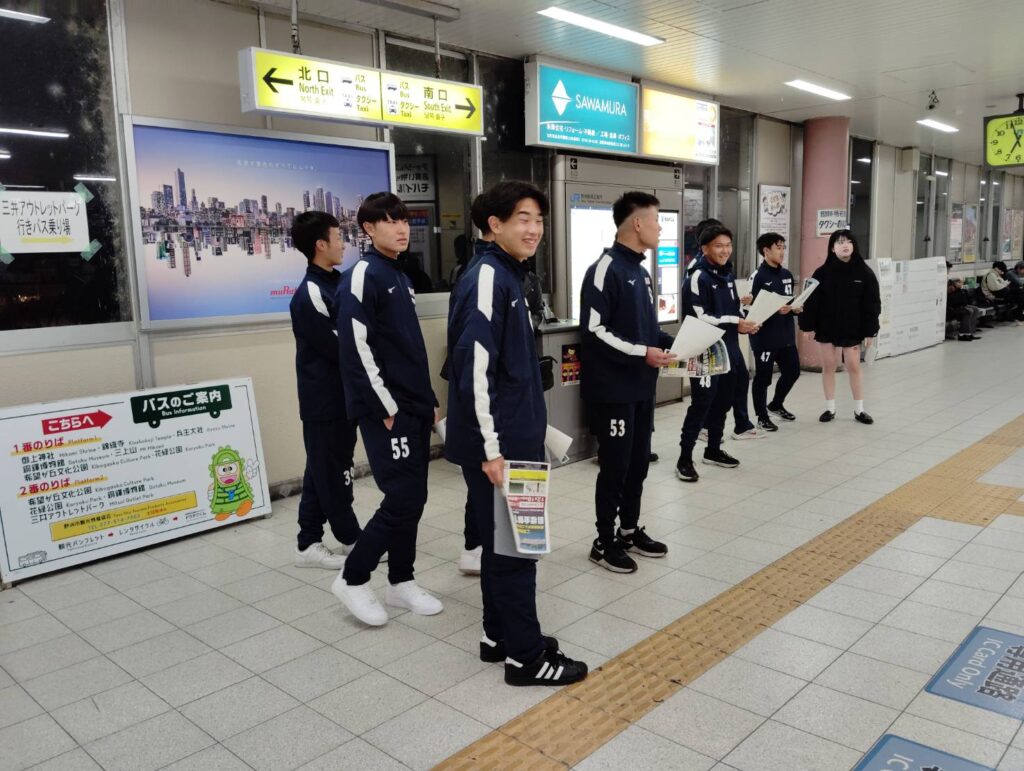 最後には、サッカー部監督の横江諒先生と部員全員がステージに立ち、会場にお集まりの皆様に本校サッカー場人工芝の状況をお伝えするとともに、全面張替に必要な資金約1億円の寄付をお願いしました。その後、野洲駅周辺においてサッカー部員全員がチラシを配布し寄付のお願いをしました。